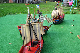 Mis tres navíos juntos, algún defectillo tienen, pero estoy de lo mas contento con ellos, lucen orgullosos, aunque sea sobre cesped artificial.